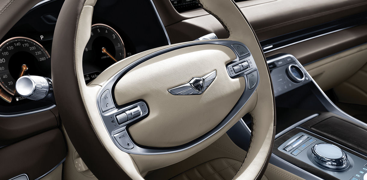 투톤 가죽 스티어링 휠 촉감이 뛰어난 가죽 스티어링 휠에 투톤 컬러 디자인으로 실내의 고급감을 초월한 제네시스만의 독창적인 경험을 완성합니다. 프라임 나파 가죽 시트 (퀄팅, 파이핑 적용) / 6인승 2열 독립시트 & 센터 콘솔 |